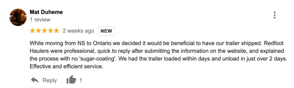 “While moving from NS to Ontario we decided it would be beneficial to have our trailer shipped. Redfoot Haulers were professional, quick to reply after submitting the information on the website, and explained the process with no ‘sugar-coating’. We had the trailer loaded within days and unload in just over 2 days. Effective and efficient service.” – Mat D.