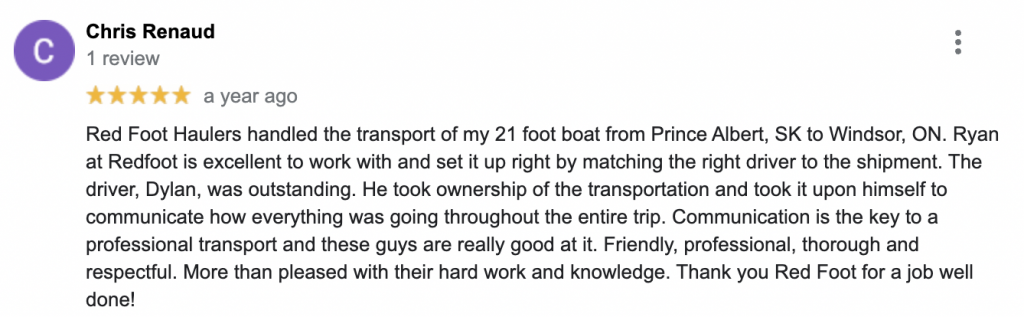 “Red Foot Haulers handled the transport of my 21 foot boat from Prince Albert, SK to Windsor, ON. Ryan at Redfoot is excellent to work with and set it up right by matching the right driver to the shipment.